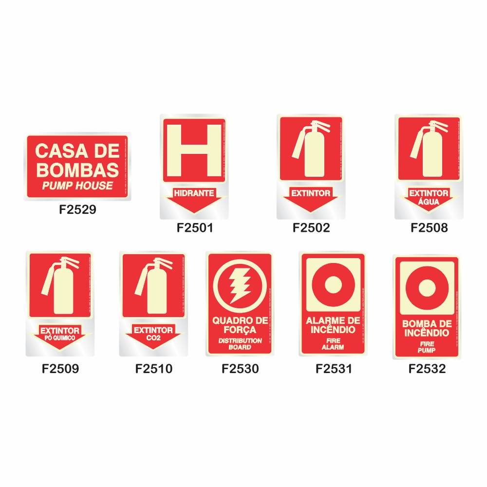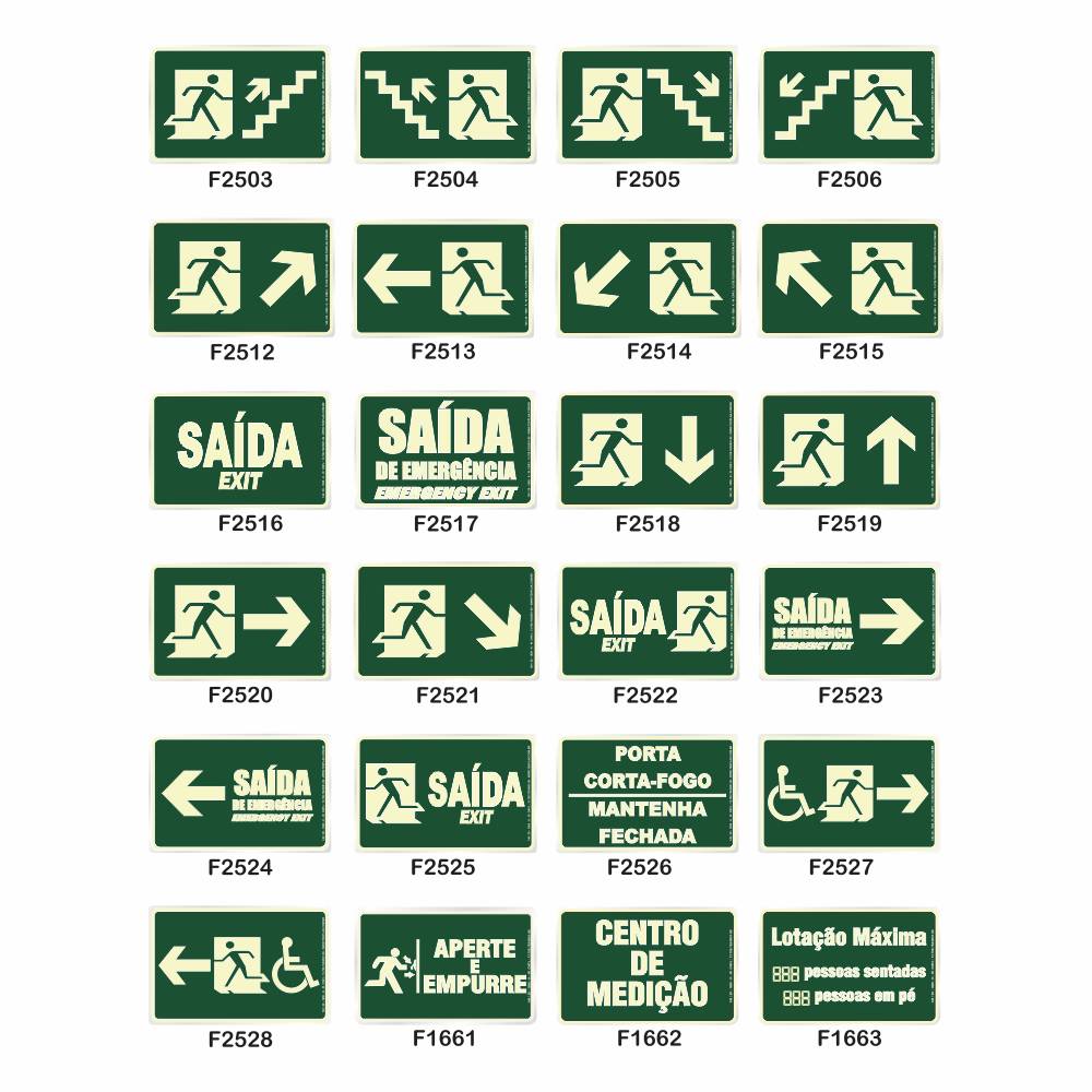 Placas Fotoluminescentes de acordo com a Norma 20 dos Bombeiros, identificada com CNPJ e Grau de Luminosidade. Material em Poliestireno virgem que não propaga chama.